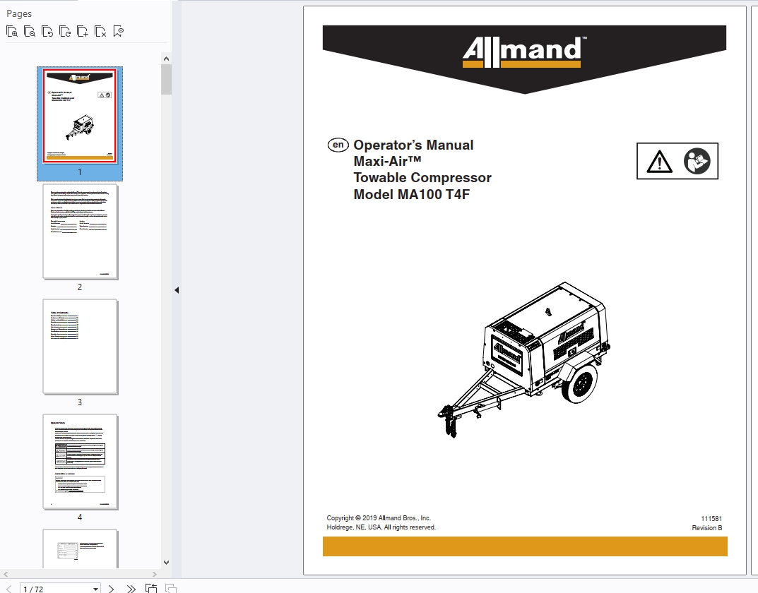 Allmand Compressor Maxi-Air MA100 T4F Operators Manual 111581 Rev B 2019 PDF