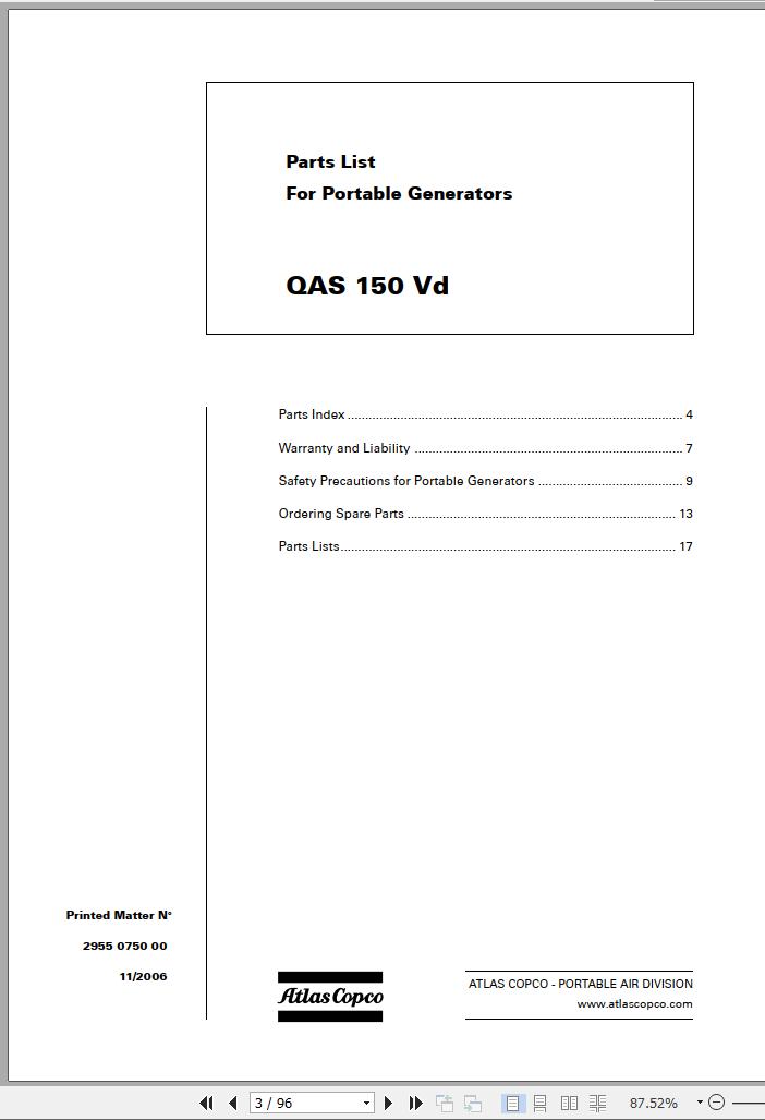 Atlas Copco QAS 150 Vd Spare Parts List 2955 0750 00
