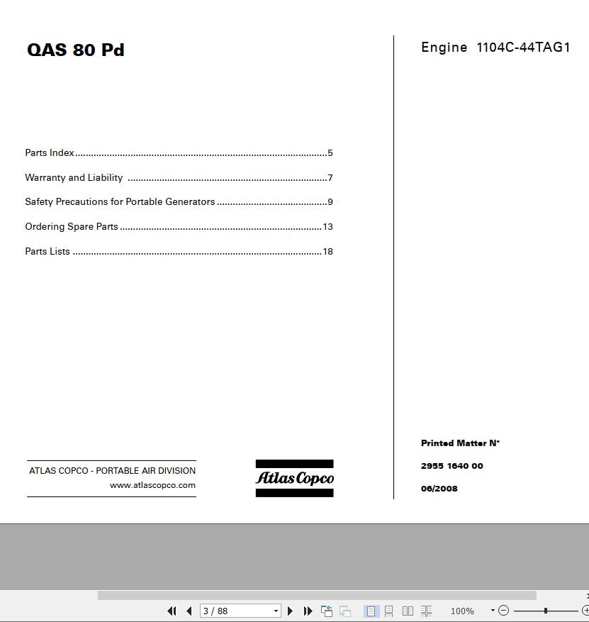 Atlas Copco QAS 80 Pd Engine 1104C-44TAG1 Spare Parts List 2955 1640 00