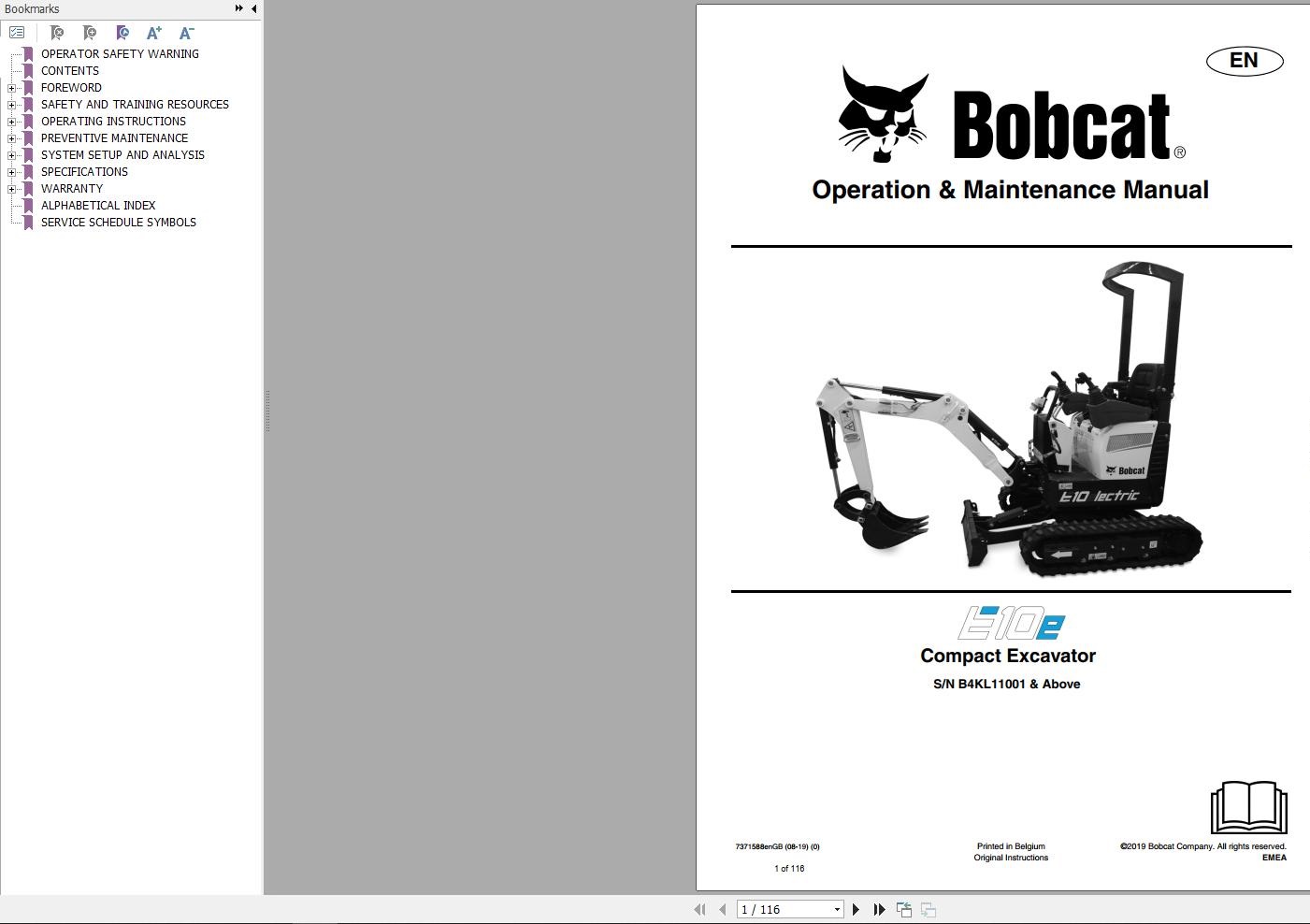 The Bookmarks of Bobcat E10e Compact Excavator Operation and Maintenance Manual: