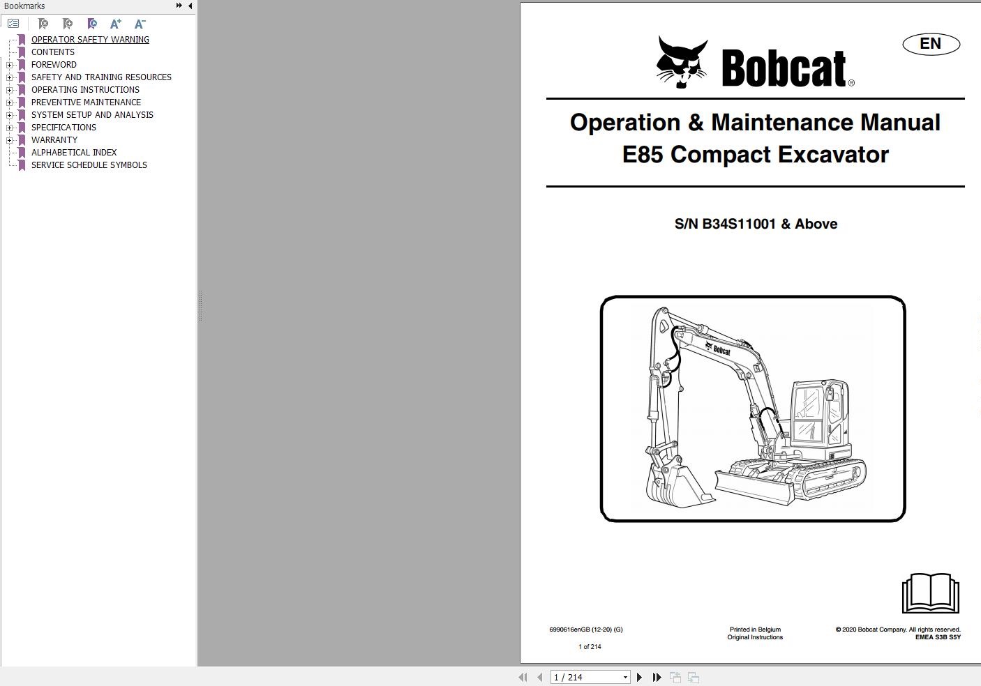 Bobcat E85 Operation And Maintenance Manual 6990616 2020 (214 Pages)