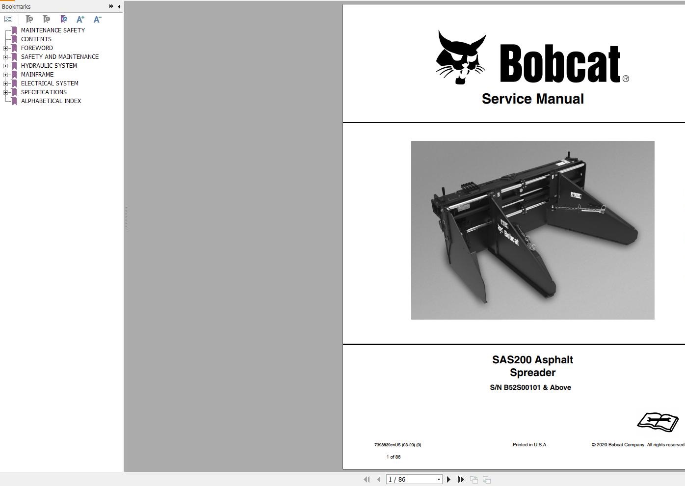 The Bookmarks of Bobcat SAS200 Asphalt Spreader Service Manual: