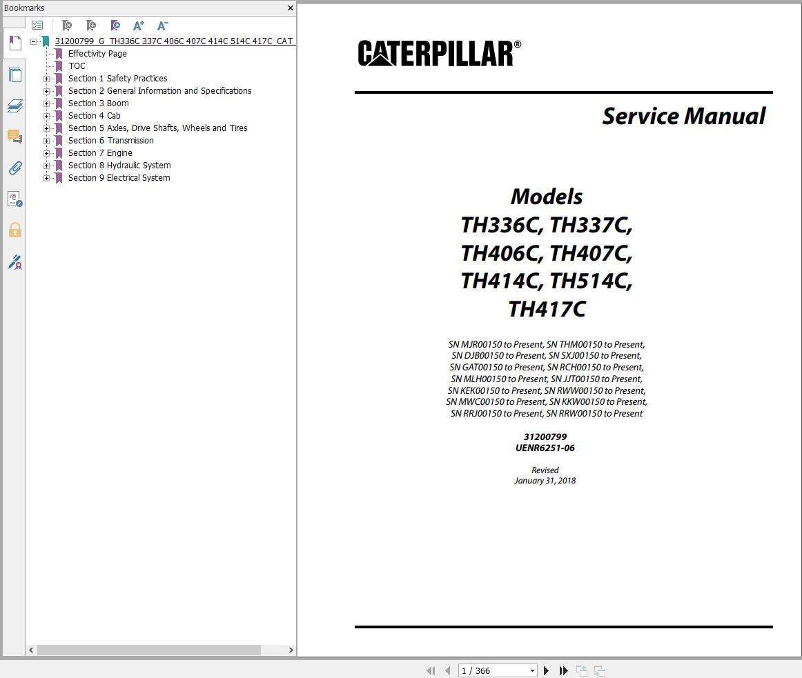 Caterpillar TH336C TH337C TH406C TH407C TH414C TH417C TH514C Service Manual 31200799 2018 (366 Pages)