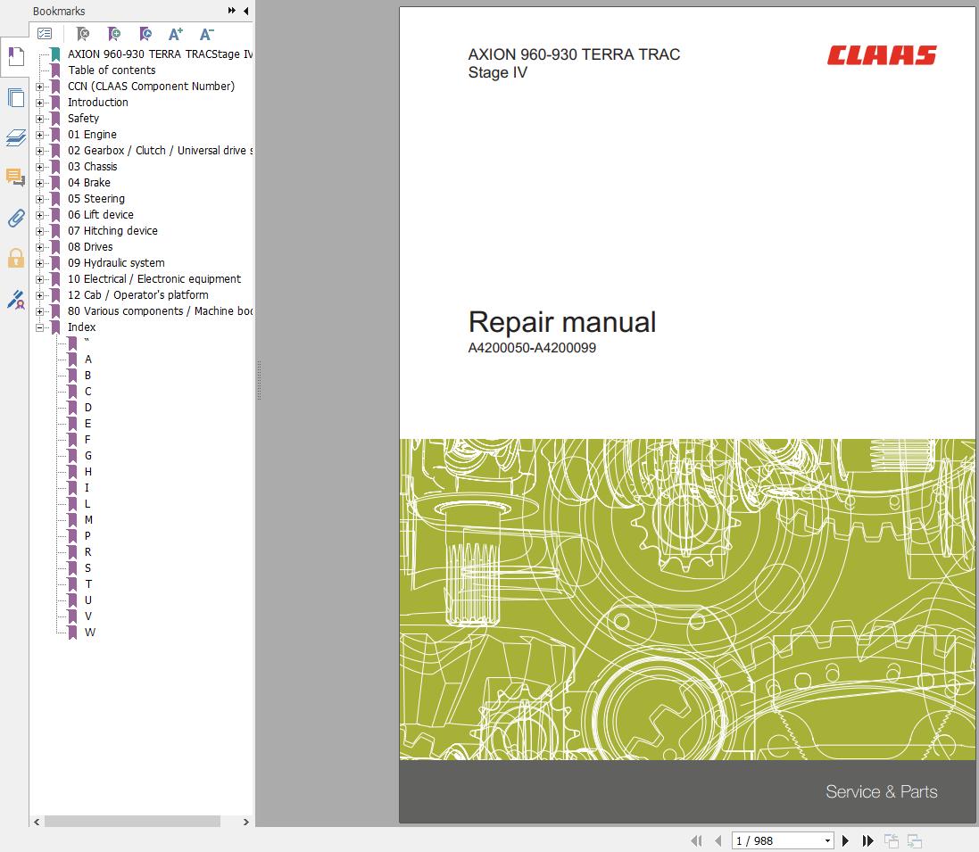 CLAAS AXION 960-930 TERRA TRAC Stage IV A4200100-A4299999 Repair Manual 00 1169 987 X PDF