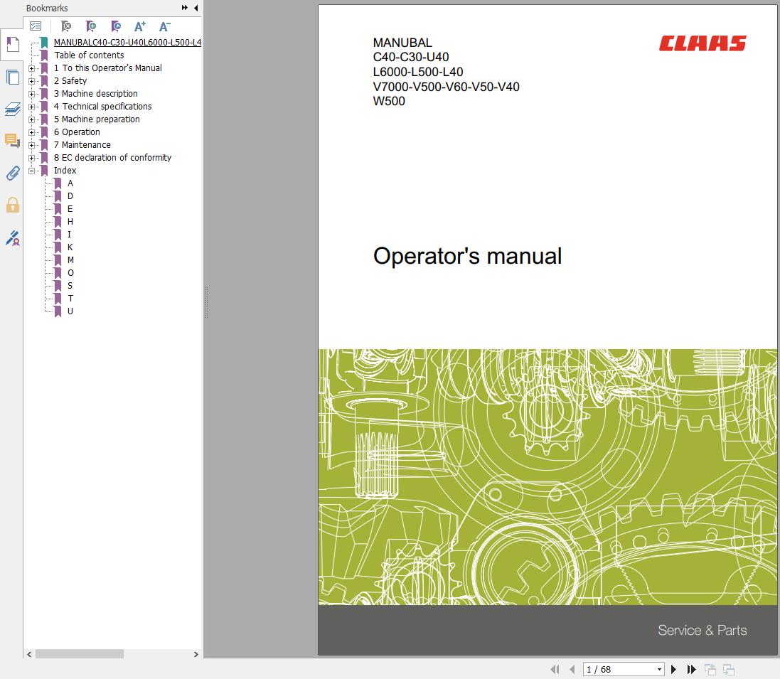 CLAAS MANUBAL C40-C30-U40 L6000‑L500‑L40 V7000-V500-V60-V50-V40 W500 Operators Manual 00 1165 934 0 PDF