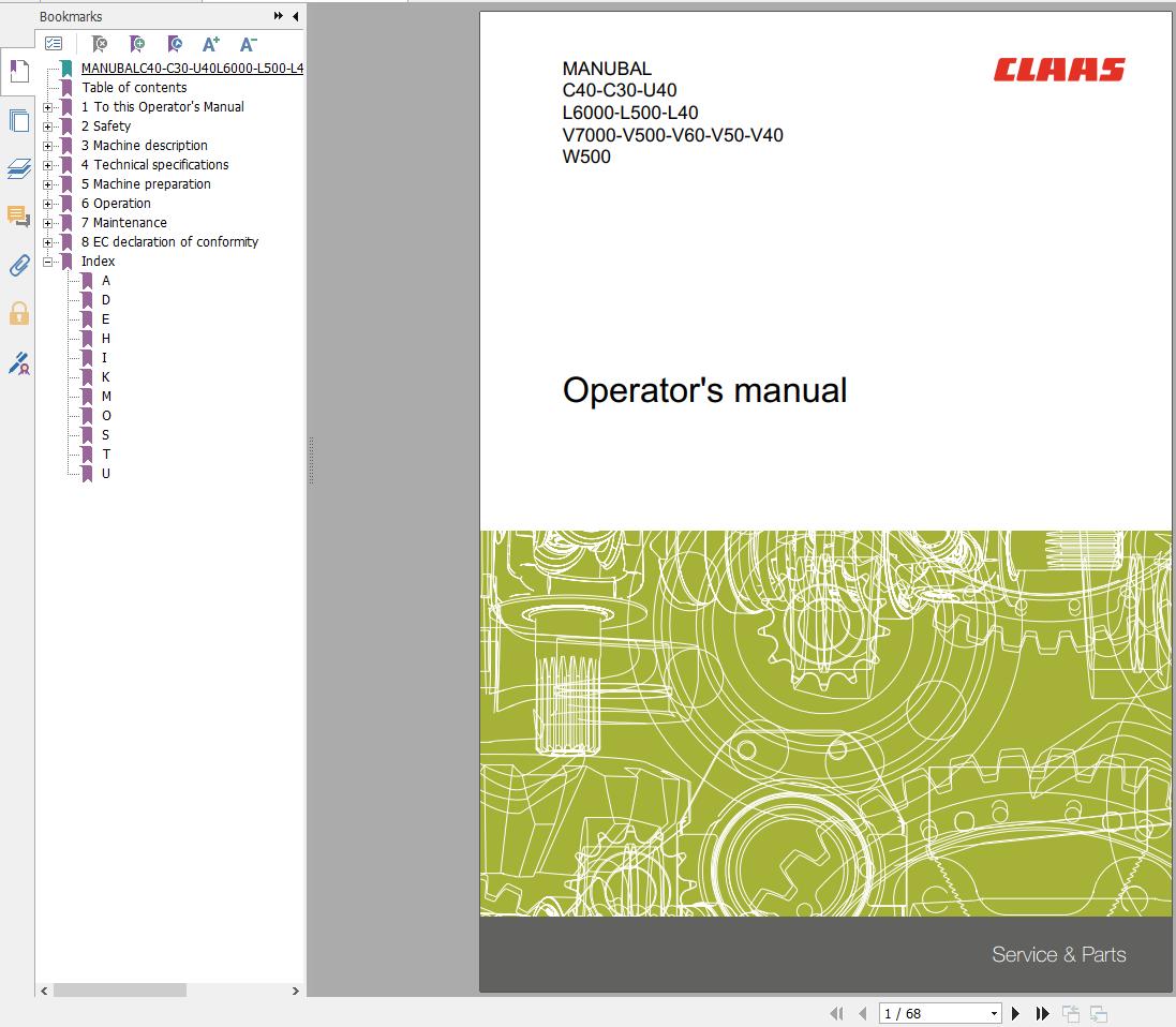 CLAAS MANUBAL C40-C30-U40 L6000-L500-L40 V7000-V500-V60-V50-V40 W500 Operators Manual 00 1165 934 0 PDF