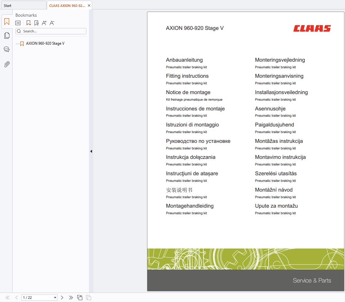 CLAAS AXION 960-920 Stage V Pneumatic Trailer Braking Kit Fitting Instruction 00 1173 104 0 PDF