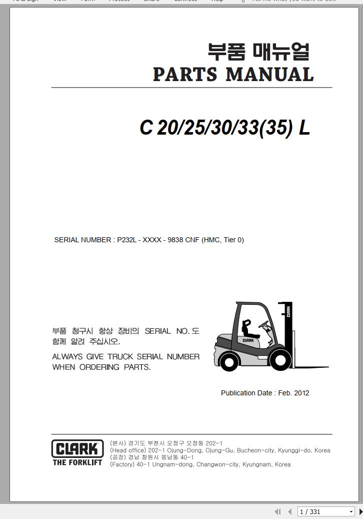 Clark C 20 25 30 33 35 L P232L 9838 CNF Parts Manual
