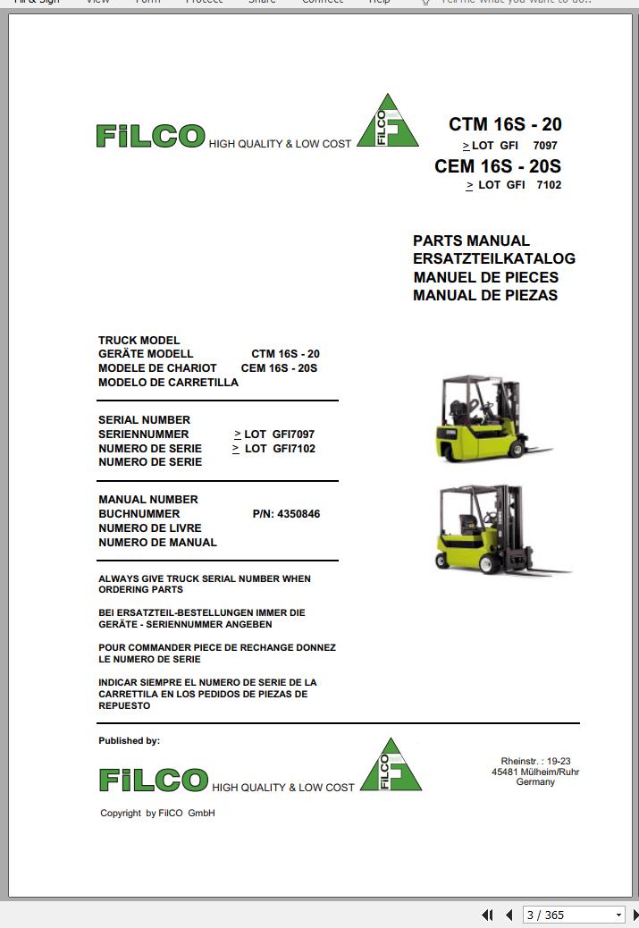 Clark CTM CEM 16S - 20S GFI 7097 7102 Parts Manual 4350846