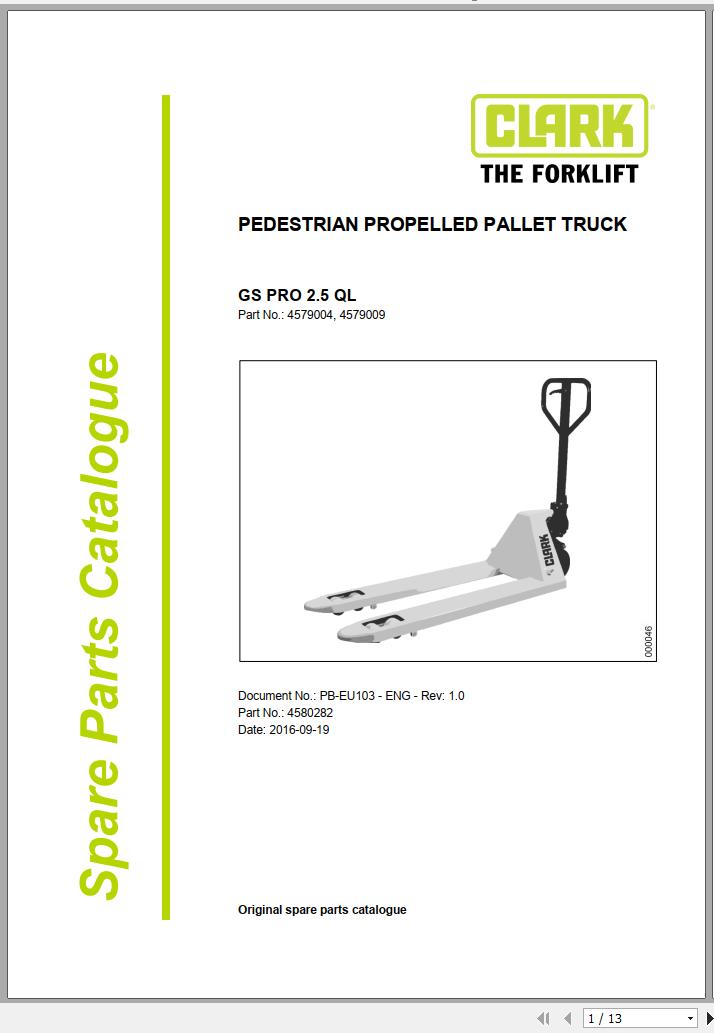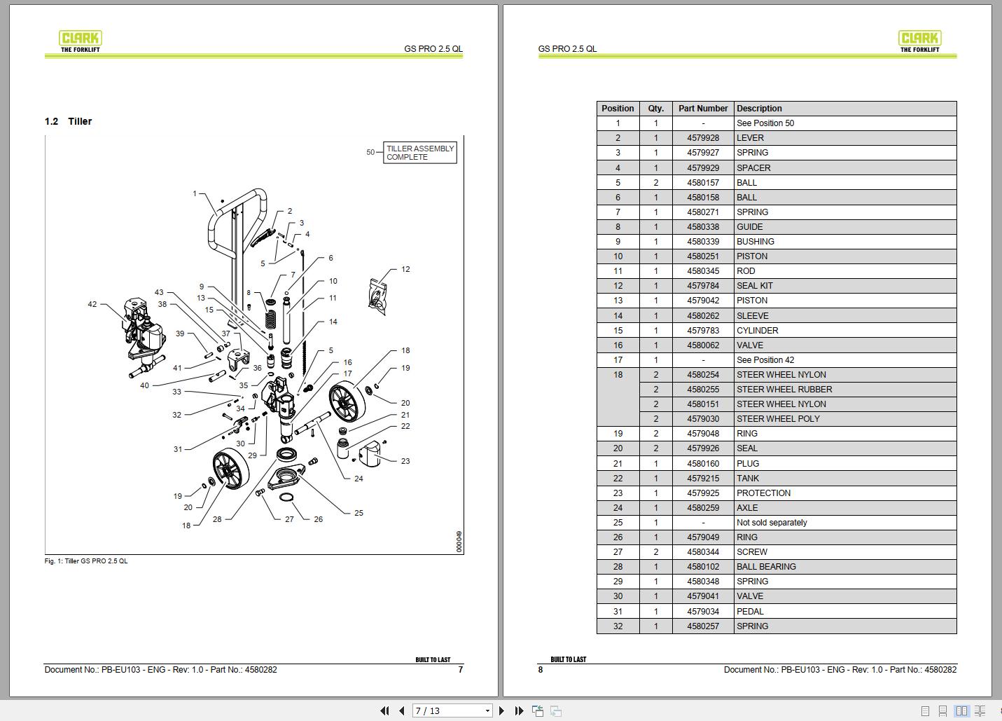Clark GS PRO 2.5 QL 4579004 4579009 Parts Manual 4580282 PB-EU103