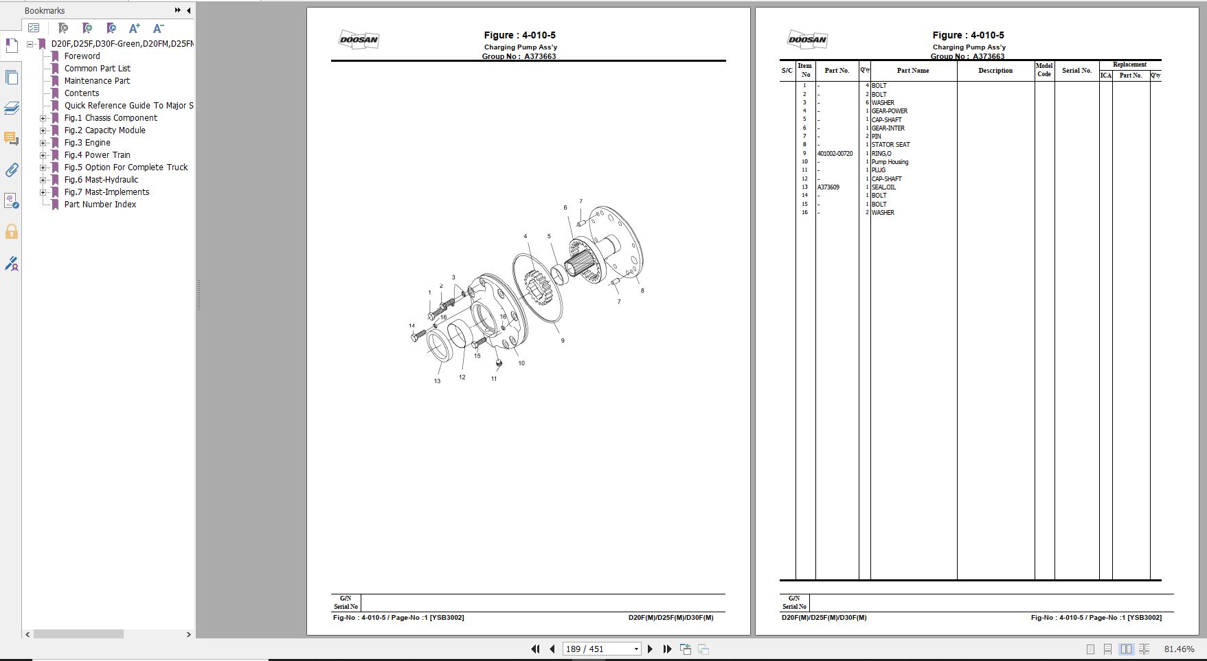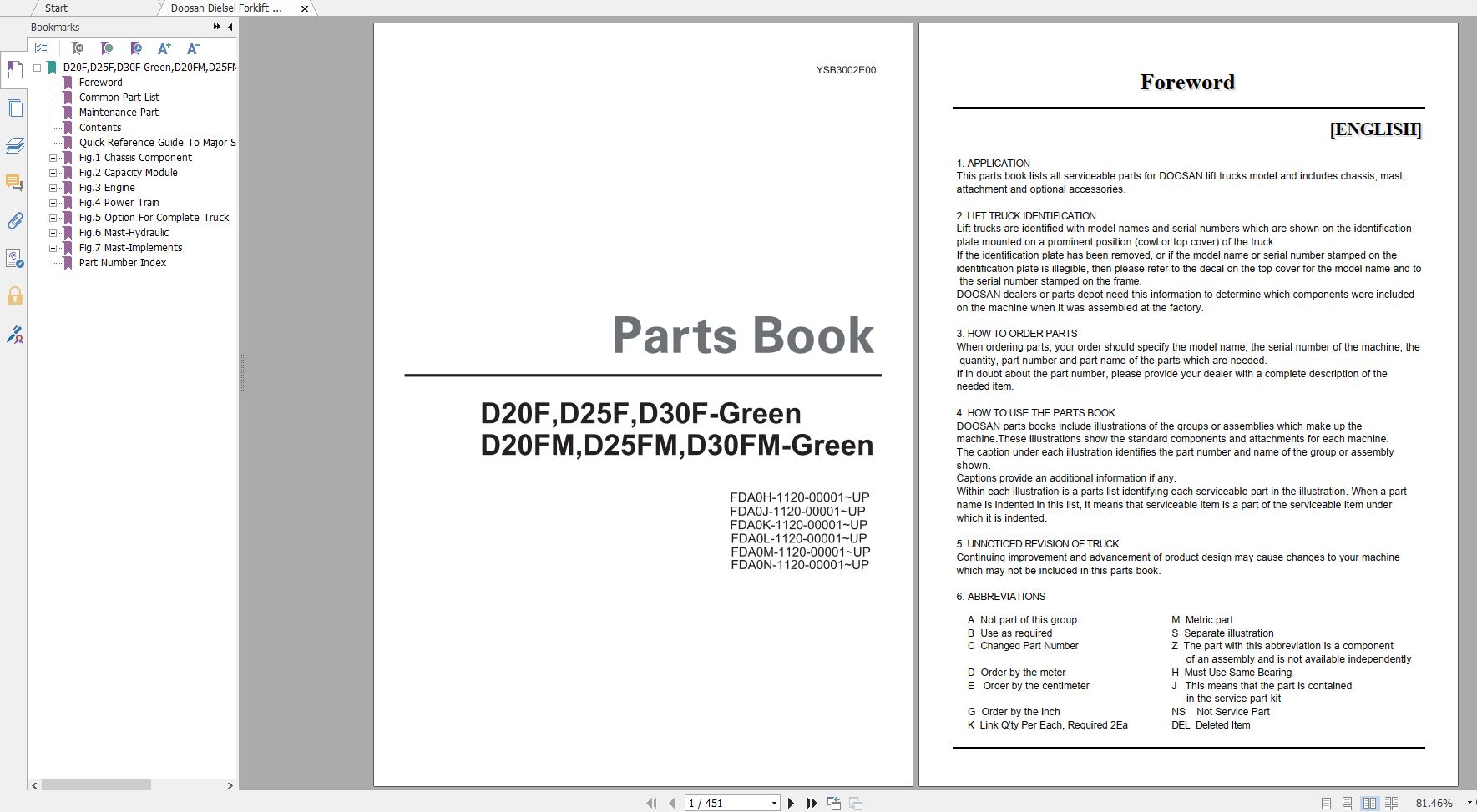 Doosan D20F D25F D30F D20FM D25FM D30FM Part Book YSB3002E