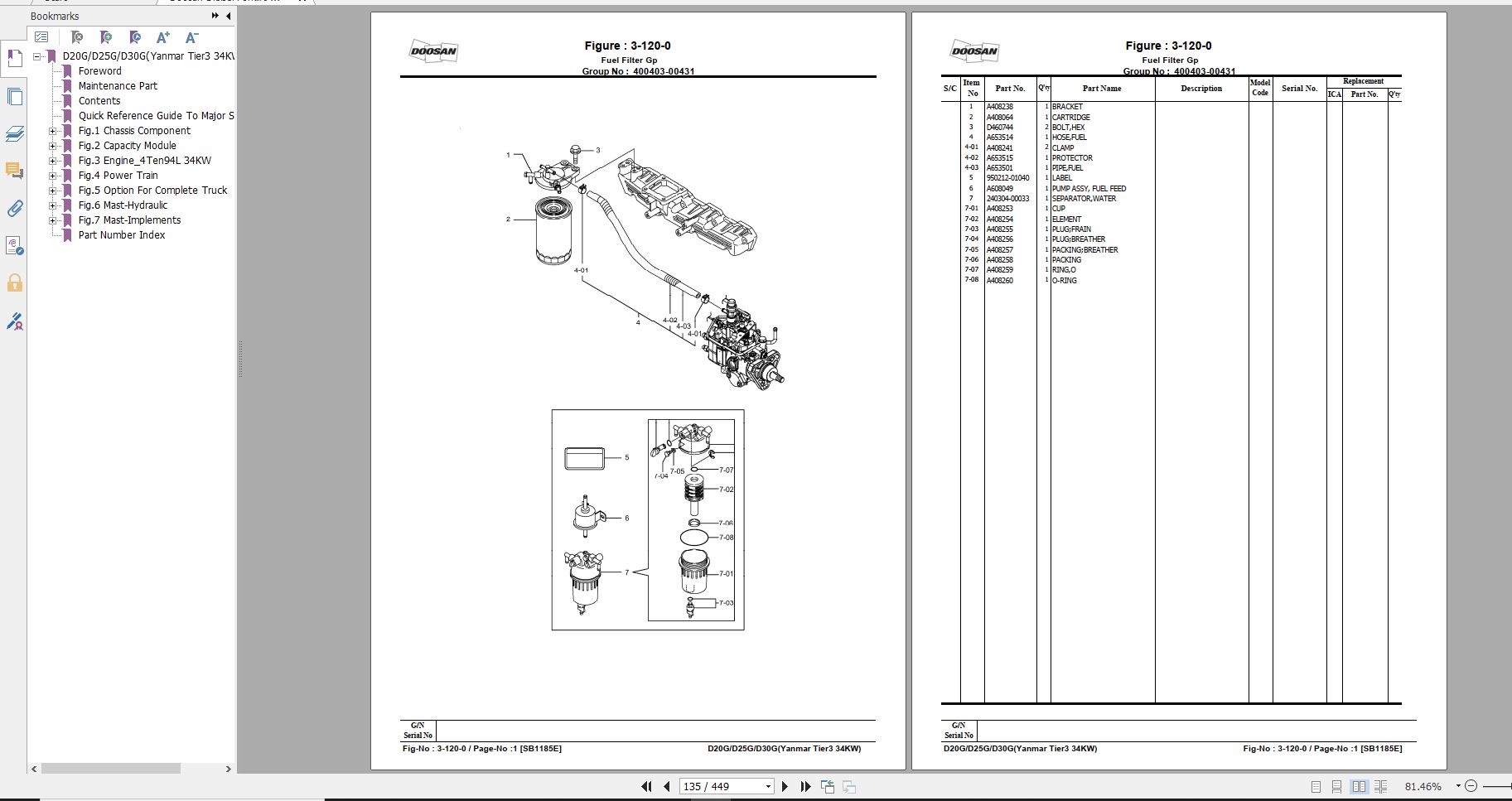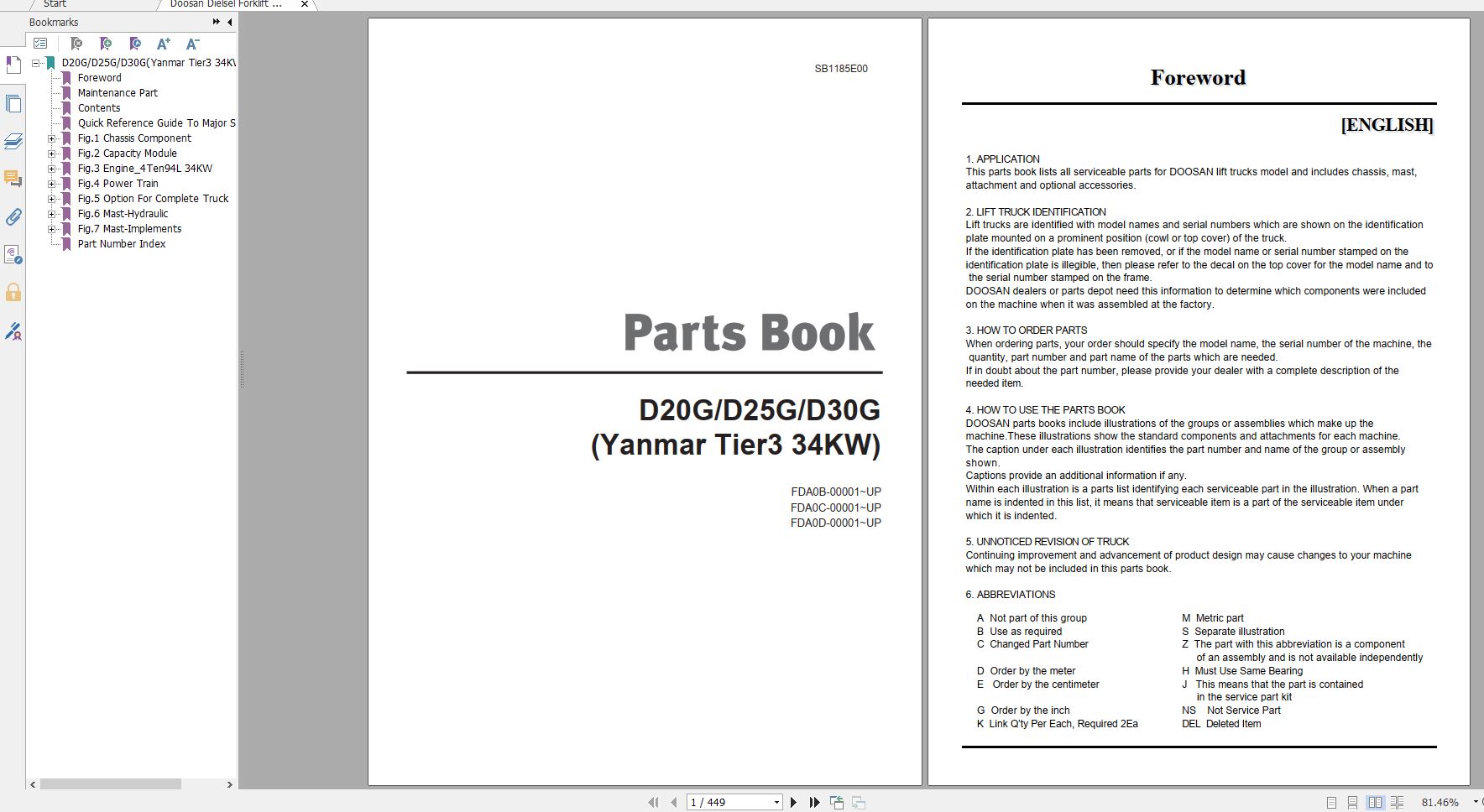 Doosan D20G D25G D30G Yanmar Tier 3 34KW Part Book SB1185E
