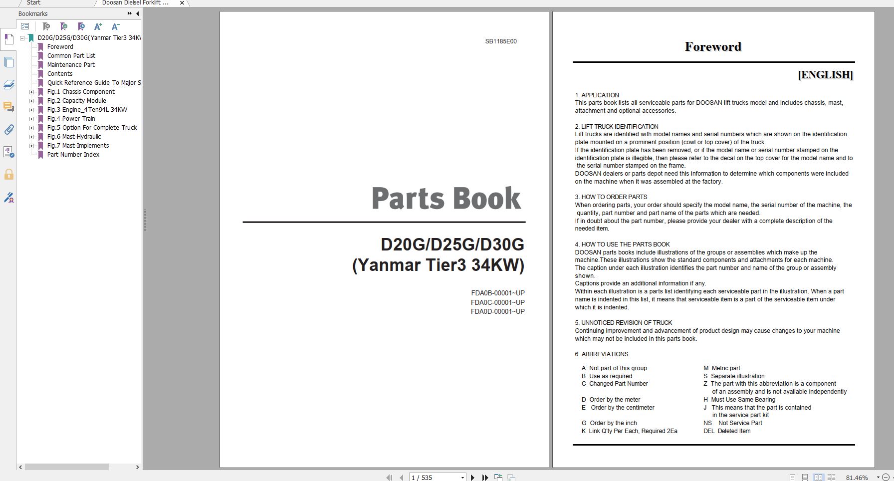 Doosan D20G D25G D30G Yanmar Tier 3 34KW Part Book SB1185E00