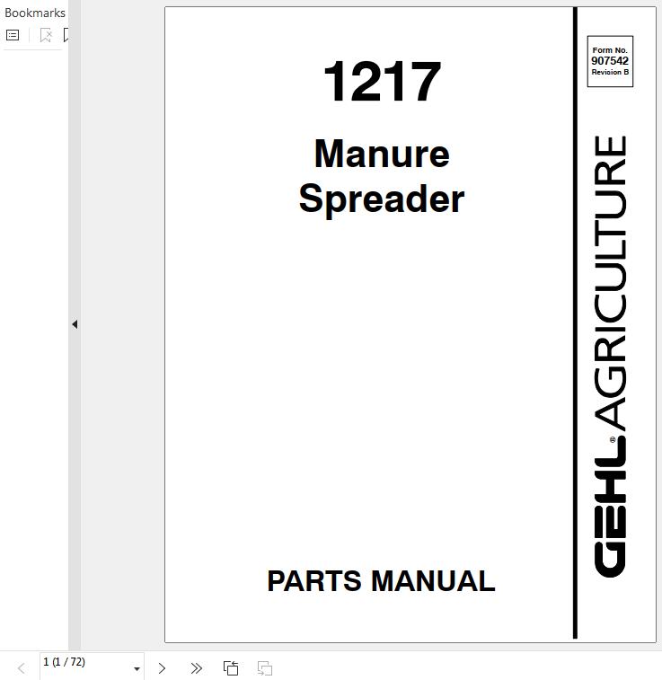 GEHL 1217 Parts Manual 907542BSize: 1.52 MBMachine: Manure SpreaderMachine Model: 1217Publication Date: 2004Page: 72 PagesForm Number: 907542B