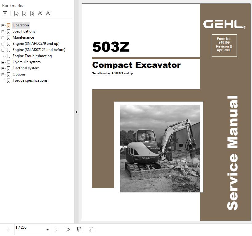 GEHL 503Z Service Manual 918159BSize: 23.6 MBMachine: ExcavatorMachine Model: 503ZPublication Date: 2009Page: 206 PagesForm Number: 918159B