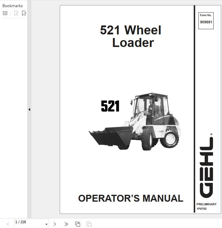 GEHL 521 Operators Manual 909881ASize: 17.7 MBMachine: Wheel LoaderMachine Model: 521Publication Date: 2002Page: 218 PagesForm Number: 909881A