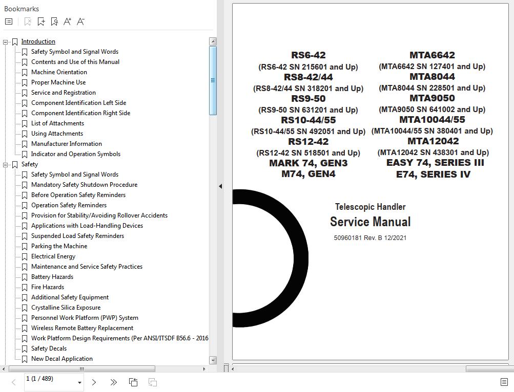 GEHL RS6-42 to 74 Series IV Service Manual 50960181B