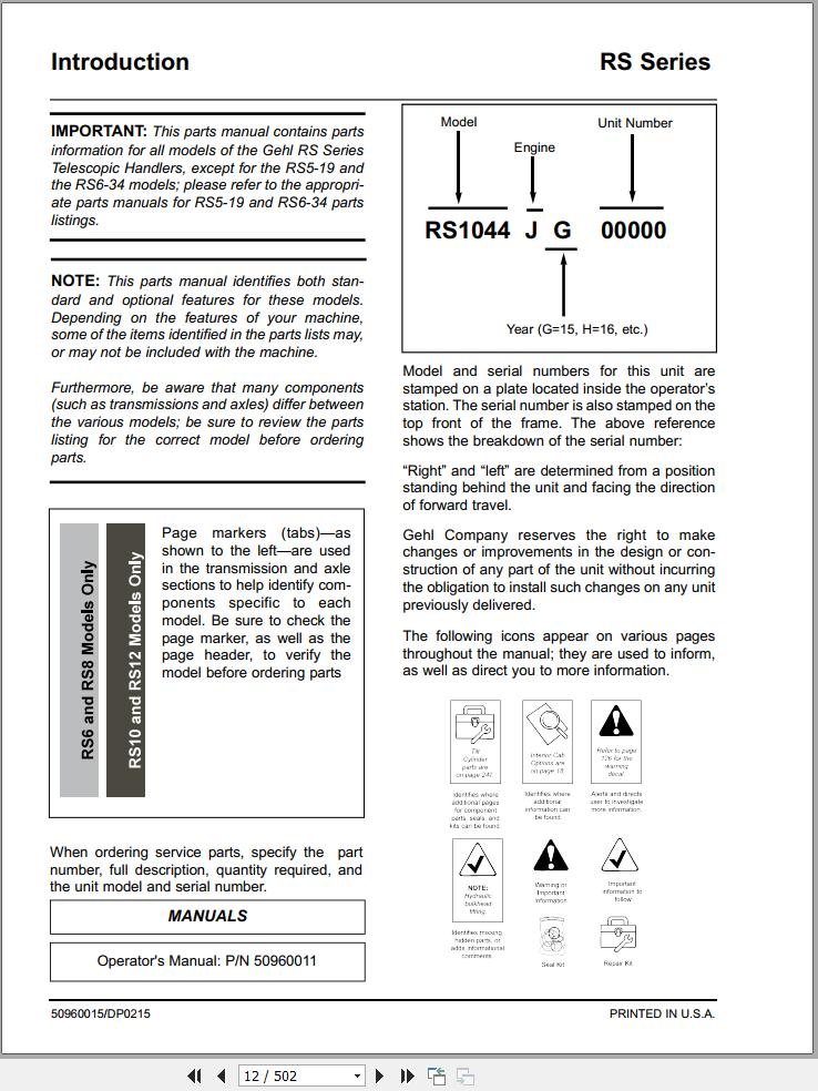 Gehl RS6 RS8 RS10 RS12 Parts Manual 50960015_2024