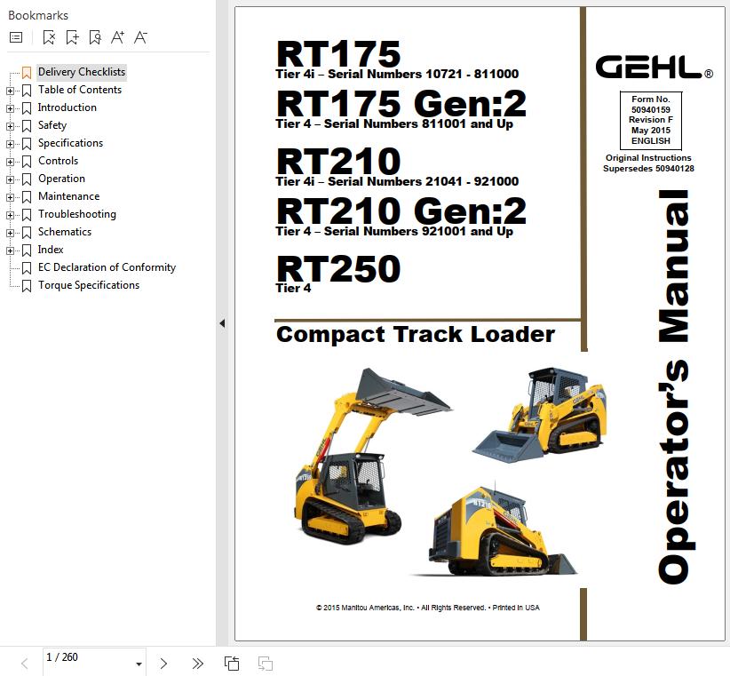 GEHL RT175 to RT250 Operators Manual 50940159F