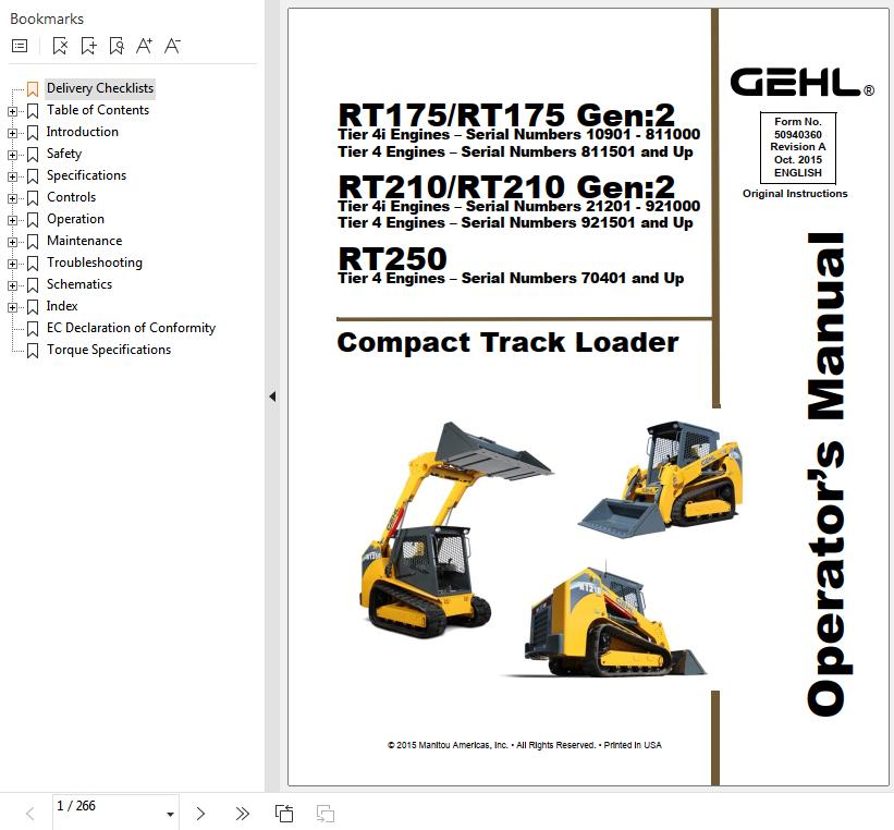 GEHL RT175 to RT250 Operators Manual 50940360A