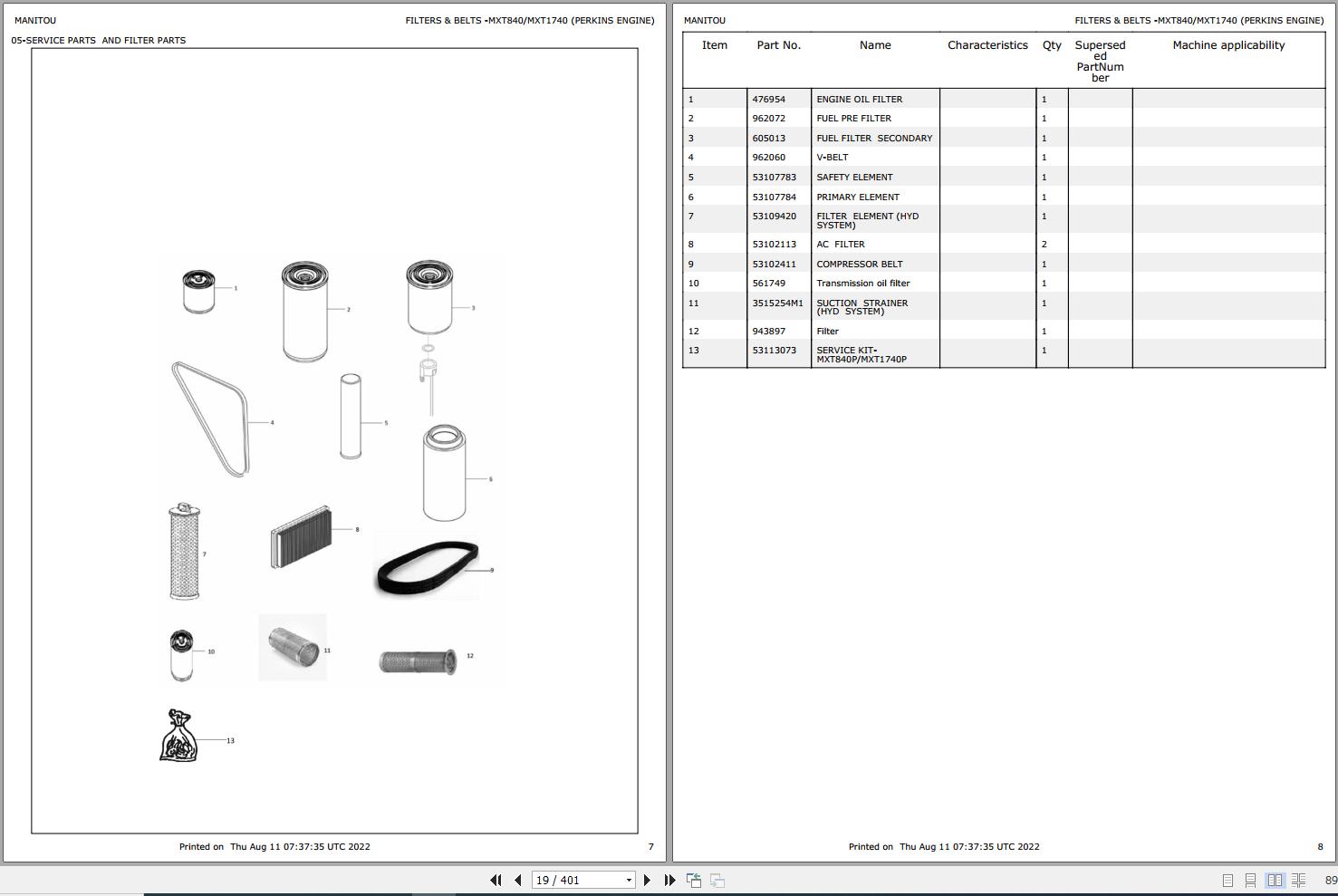 FILTERS & BELTS -MXT840/MXT1740 (PERKINS ENGINE)