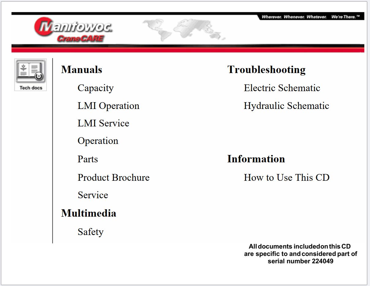Document: Load Charts, Operation Manual, Parts Catalog, Service Manual, Schematics