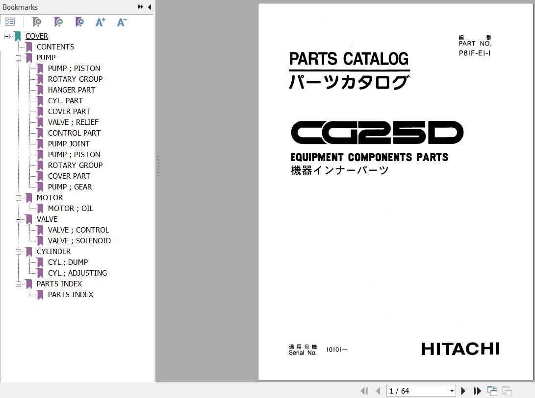 The Bookmarks of Hitachi CG25D Equipment Components Parts Catalog: