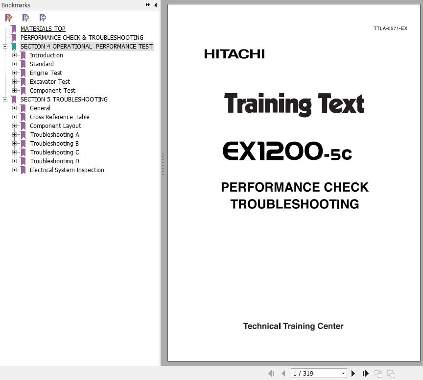 The Bookmarks of Hitachi EX1200-5C Hydraulic Excavator Training Text Performance Check Troubleshooting: