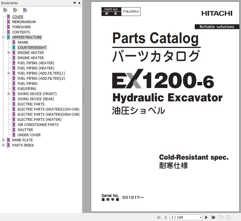 Hitachi EX1200-6 Parts Catalog P18J-OP3-2 EN JP 104 Pages