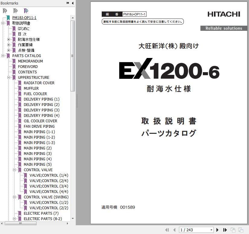 Hitachi EX1200-6 Parts Catalog PM18J-OP11-1 EN JP 243 Pages