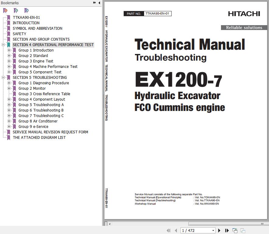 Hitachi EX1200-7 FCO Cummins Technical Manual Troubleshooting TTKAA90-EN-01(20210118) 472 Pages