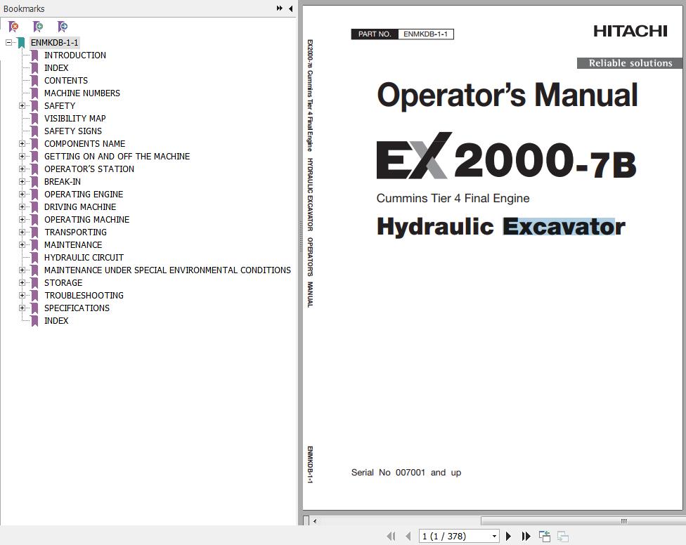 Hitachi EX2000-7B T4F Cummins Operator's Manual ENMKDB-1-1