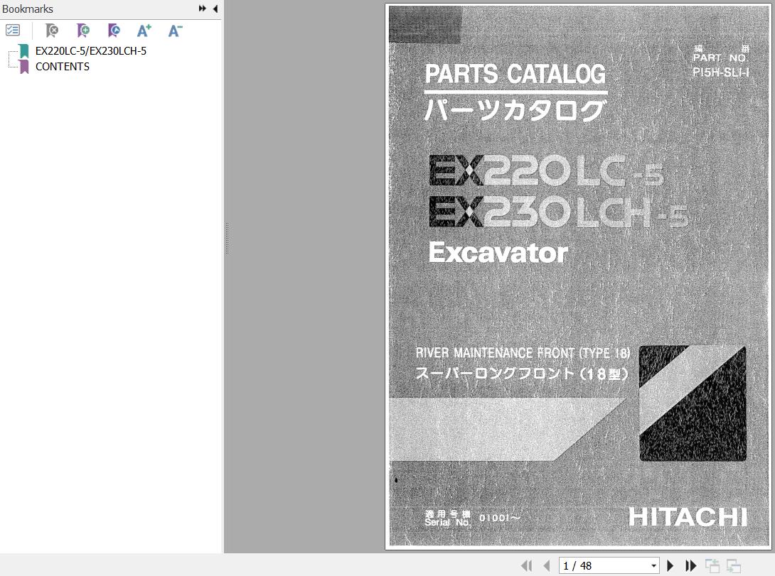 Hitachi EX220LC-5 EX230LCH-5 River Maintenance Front Type 18 Parts Catalog P15H-SL1-1 48 Pages