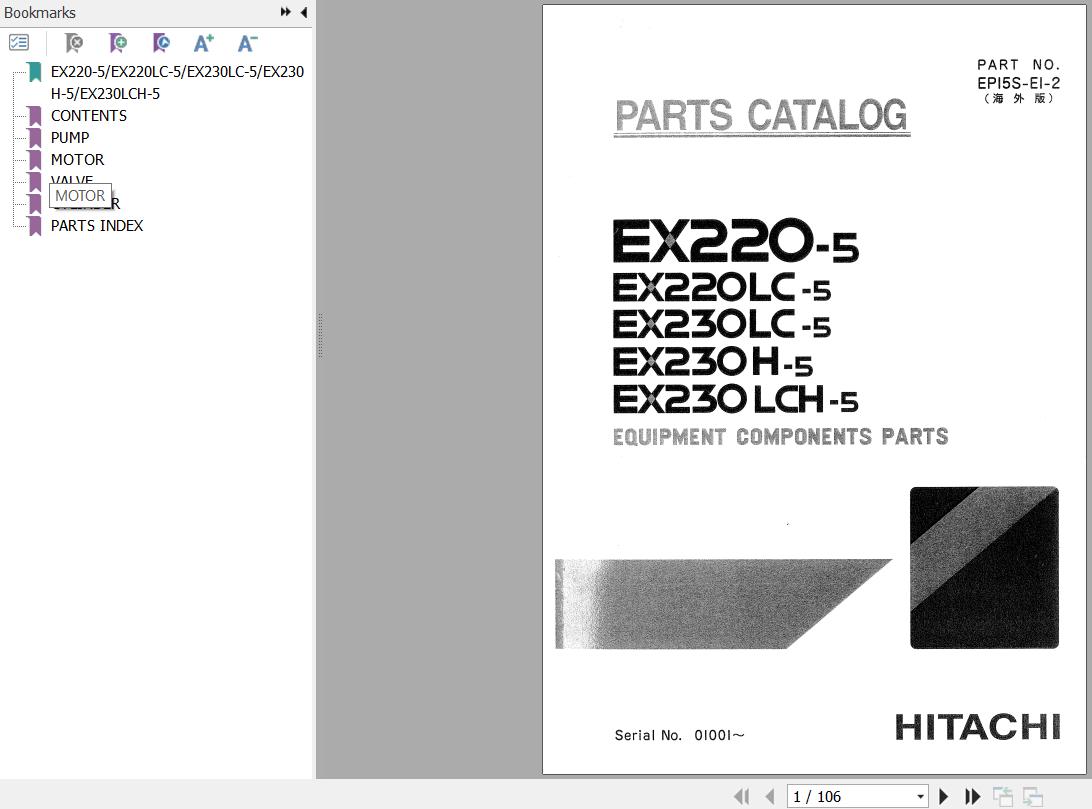 Hitachi EX220-5 220LC-5 230LC-5 230H-5 230LCH-5 Equipment Components Parts Catalog EP15S-E1-2 EN JP 106 Pages