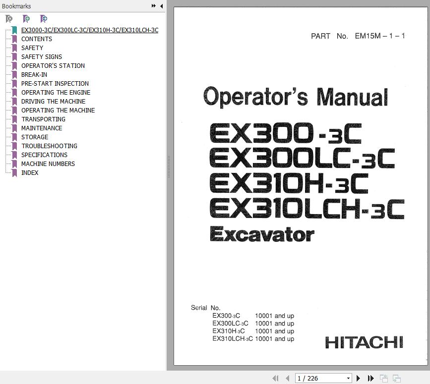 Hitachi EX300-3C To EX310LCH-3C Operator's Manual EM15M-1-1