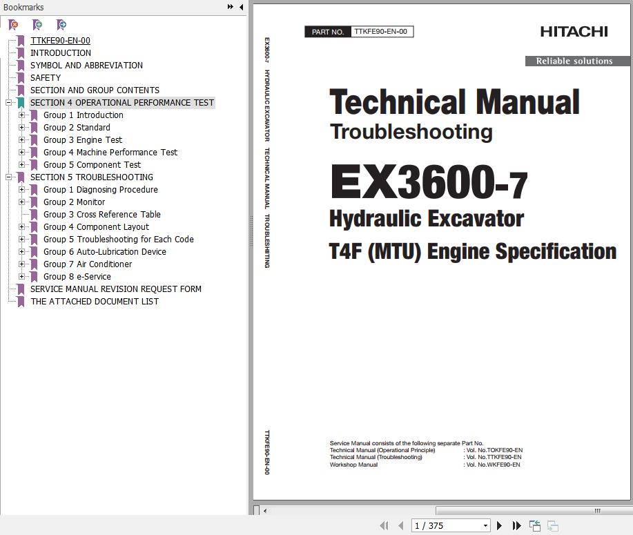 The Bookmarks of Hitachi EX3600-7B Hydraulic Excavator T4F MTU Technical Manual Troubleshooting: