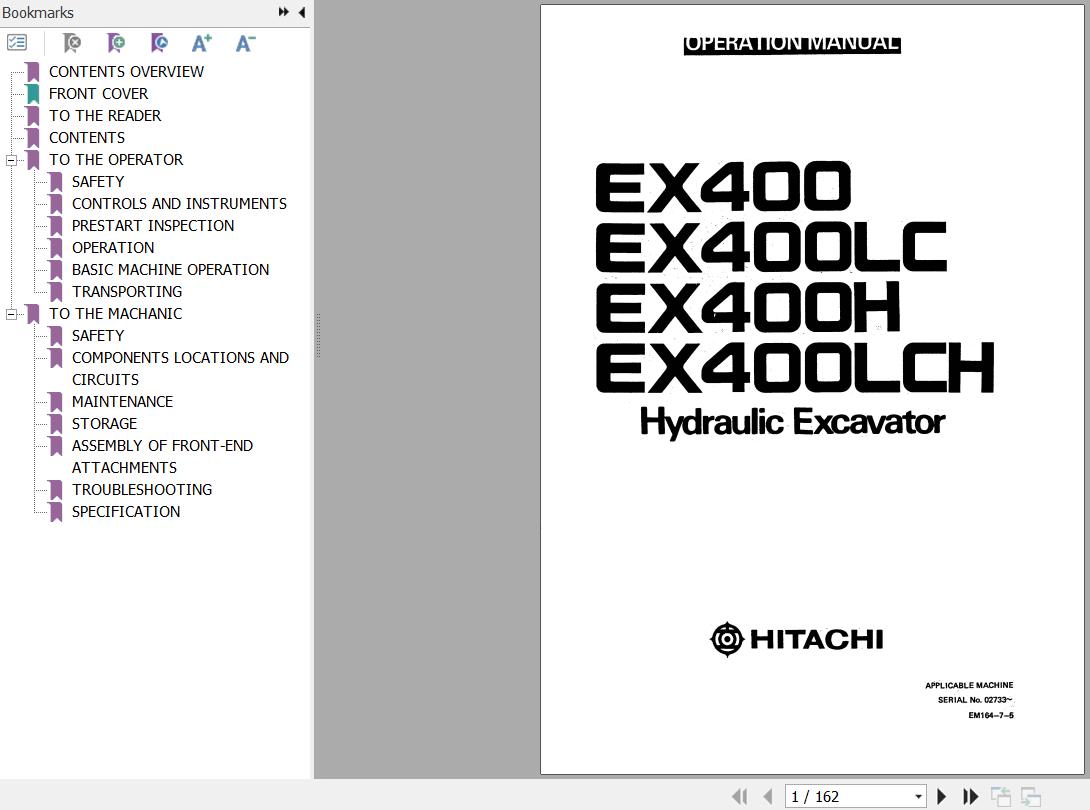 Hitachi EX400 400LC 400H 400LCH Operator's Manual EM164-7-5