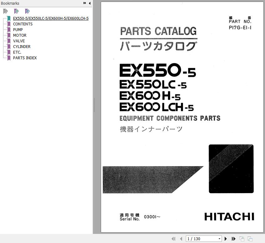 Hitachi EX550-3 To EX600LCH-3 Equipment Component Parts Catalog P17G-E1-1 EN JP 130 Pages