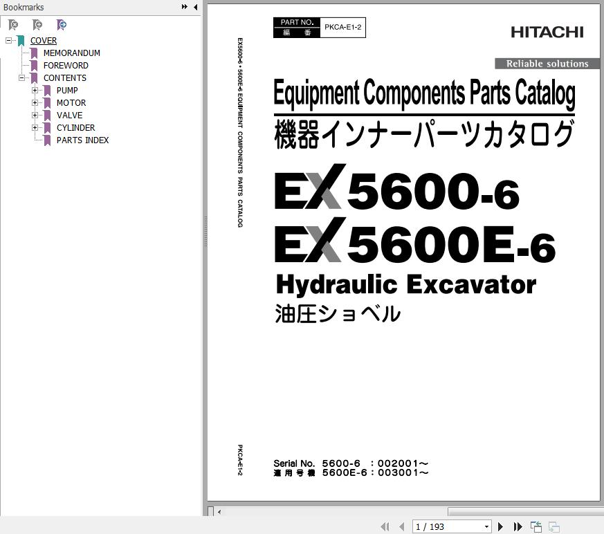 Hitachi EX5600-6 EX5600E-6 Equipment Components Parts Catalog PKCA-E1-2 EN JP 193 Pages