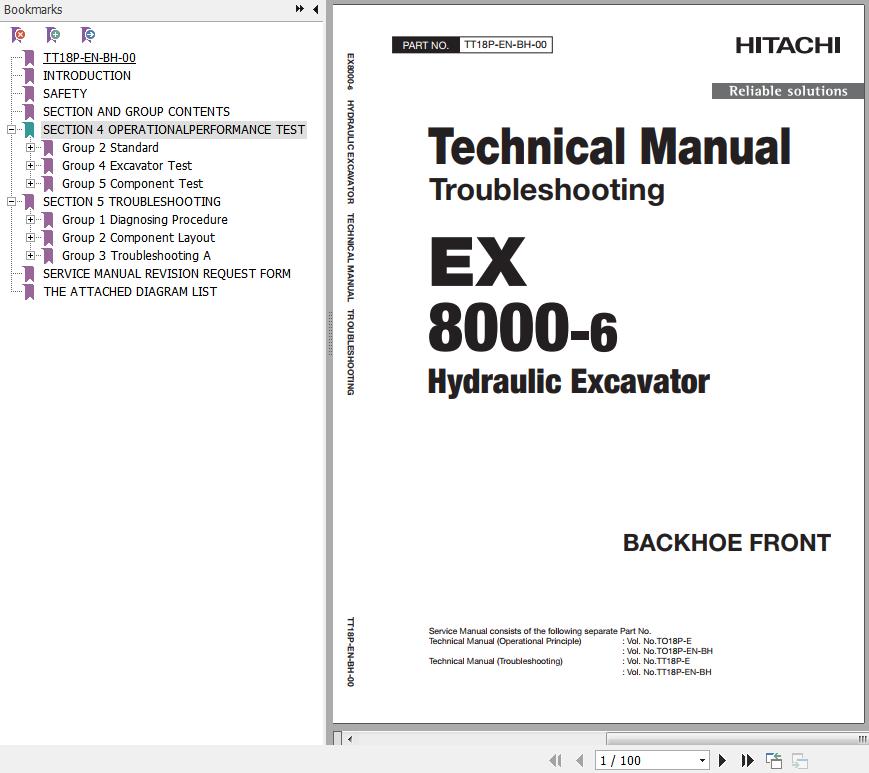 Hitachi EX8000-6 Backhoe Front Technical Manual Troubleshooting TT18P-EN-BH-00 100 Pages