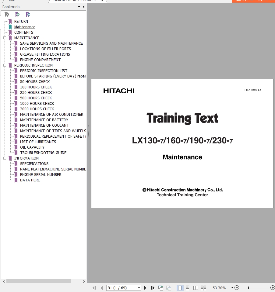 Hitachi LX130-7 LX160-7 LX190-7 LX230-7 Maintenance Manual TTLA-0490-LX