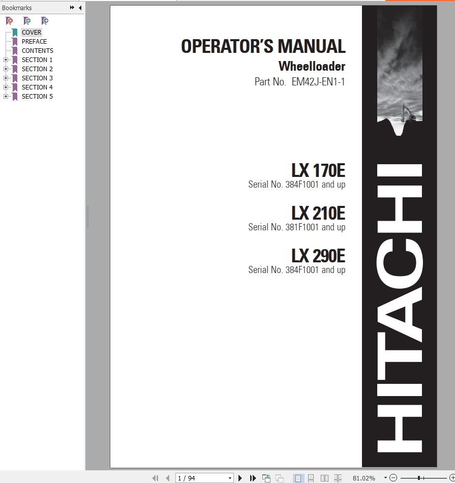 Hitachi LX170E LX210E LX290E Operator's Manual EM42J-EN1-1