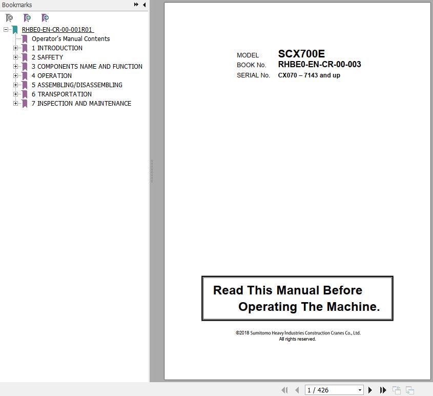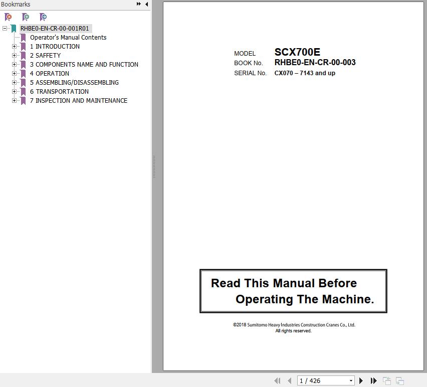 The Bookmarks of Hitachi SCX700E Hydraulic Crawler Crane Operator's Manual: