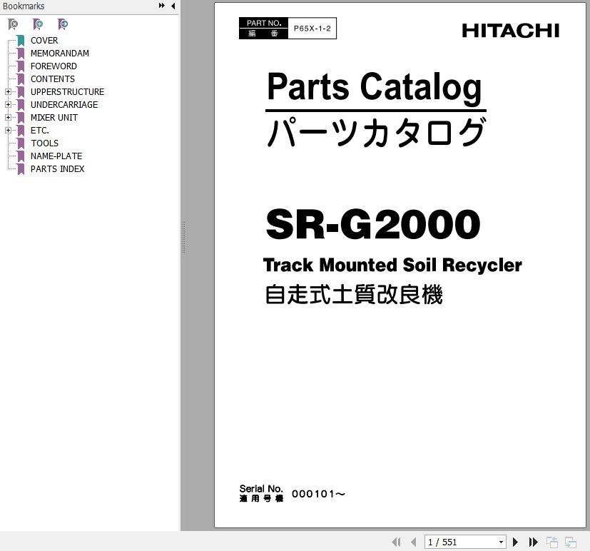 Hitachi SR-G2000 Track Mounted Soil Recycler Parts Catalog P65X-1-2 EN JP 551 Pages 2007