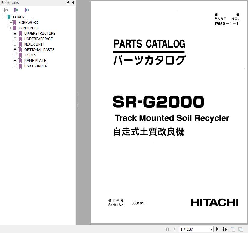 Hitachi SR-G2000 Track Mounted Soil Recycler Parts Catalog P65X-1-1 EN JP 287 Pages 2002