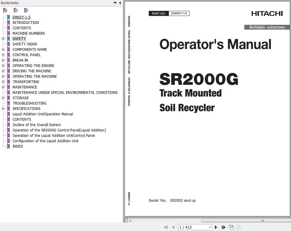 Hitachi SR2000G Track Mounted Soil Recycler Operator's Manual EM65Y-1-5