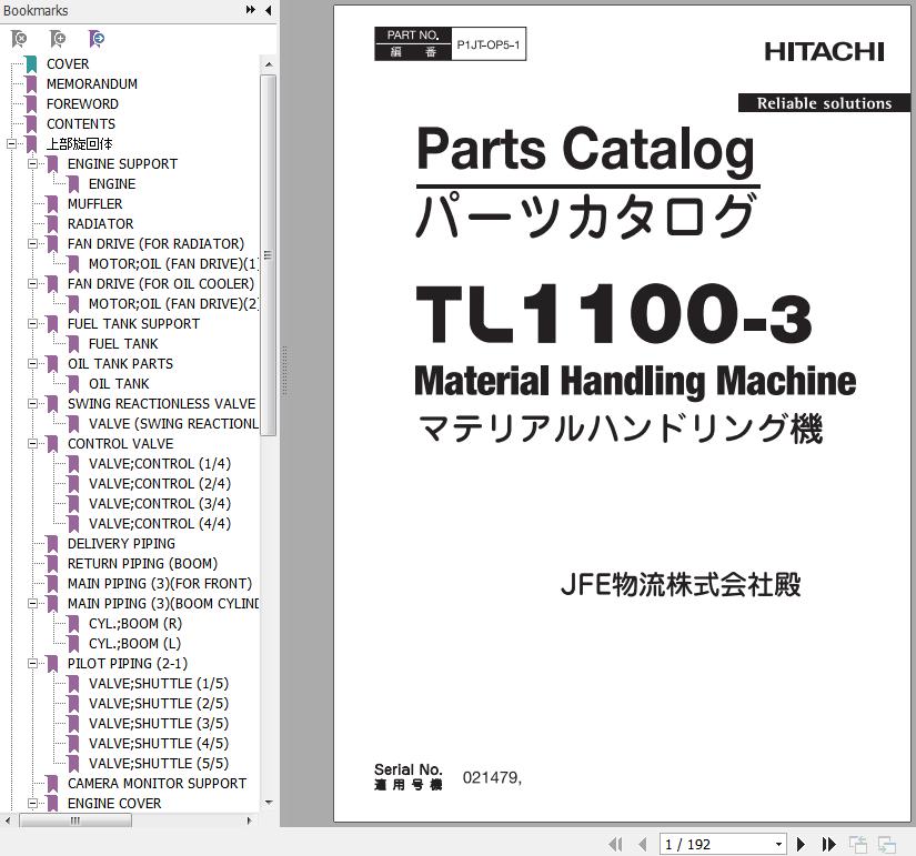 Hitachi TL1100-3 Material Handling Machine Parts Catalog P1JT-OP5-1 EN JP 192 Pages 2015