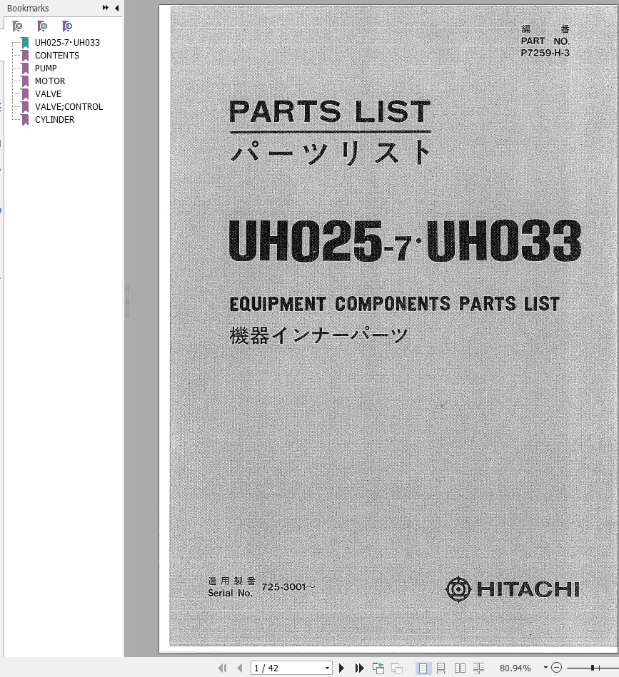 Hitachi UH025-7 UH033 Parts List P7259-H-3
