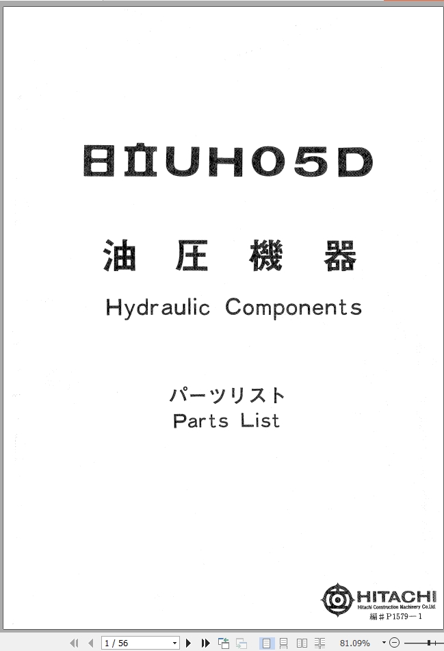 Hitachi UH05D Parts List P1579-1Size: 4.0 MBMachine: ExcavatorMachine Model: UH05DPage: 56 PagesPart Number: P1579-1