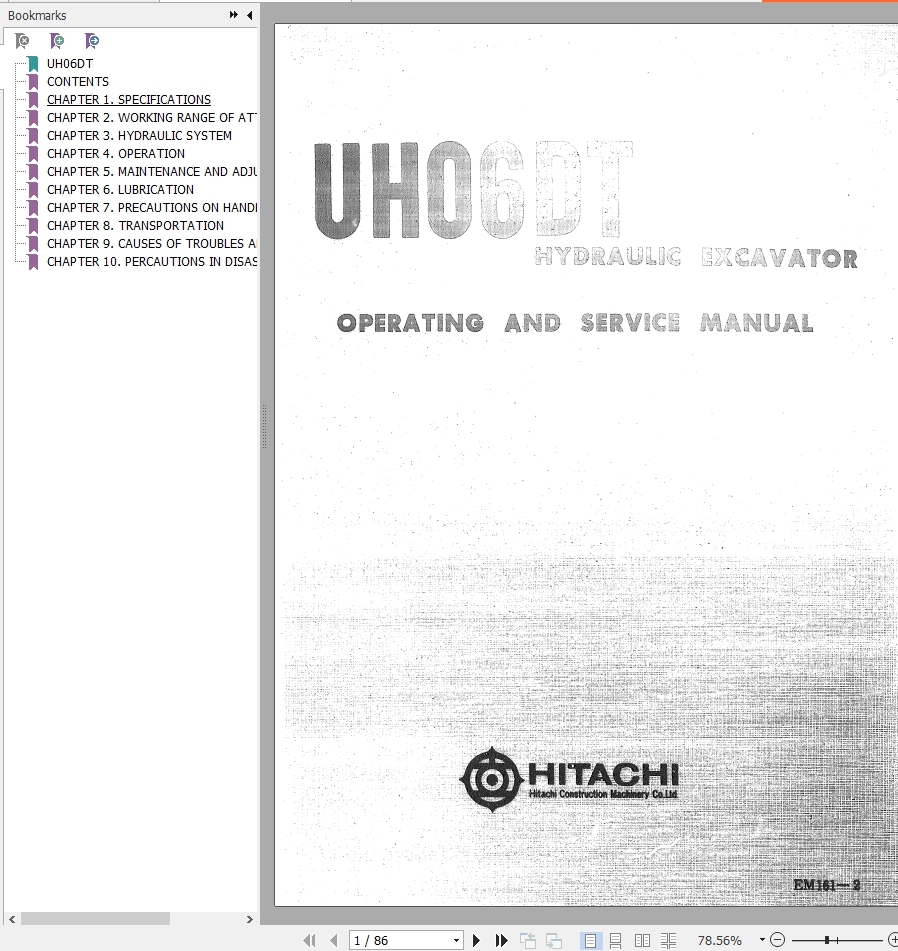 The Bookmarks of Hitachi UH06DT Excavator Operating And Service Manual: